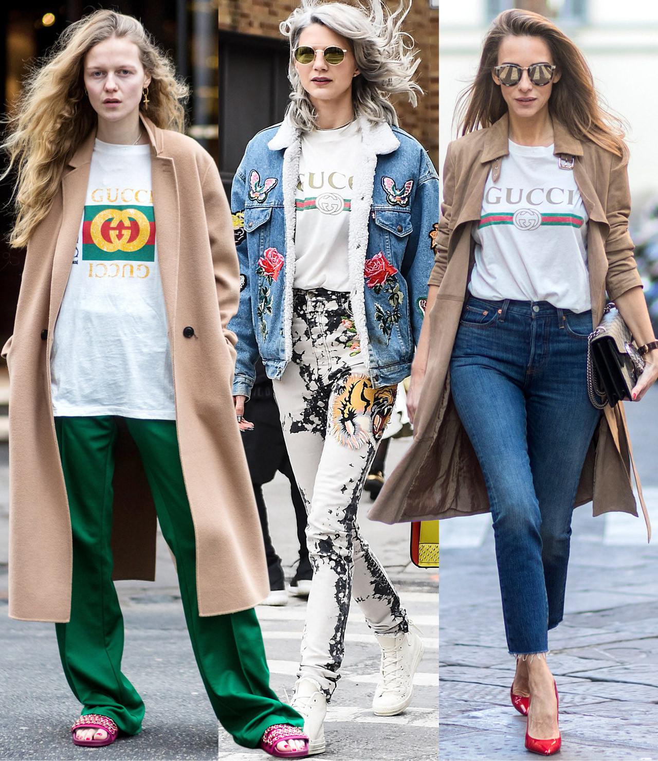 Di mana-mana Gucci. Brand favorit para selebriti dan bintang street style ini jelas mengambil alih kuasa trend street style. Kaos putih sederhana dengan logo retro Gucci ini memang effortlessly chic. Karena hanya kaos, jadi mudah dipadu dengan tas berwarna cerah, colorful scarf, trendy track pants, dan red pumps.